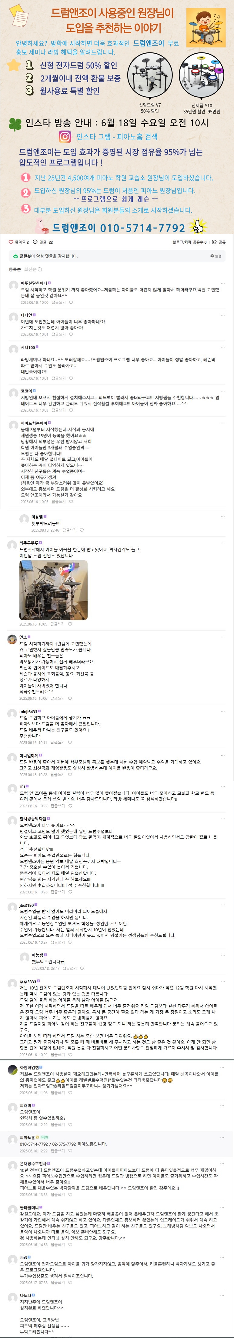 드럼도입하고 좋았던 원장님 이야기 - 열피쌤 댓글 공유